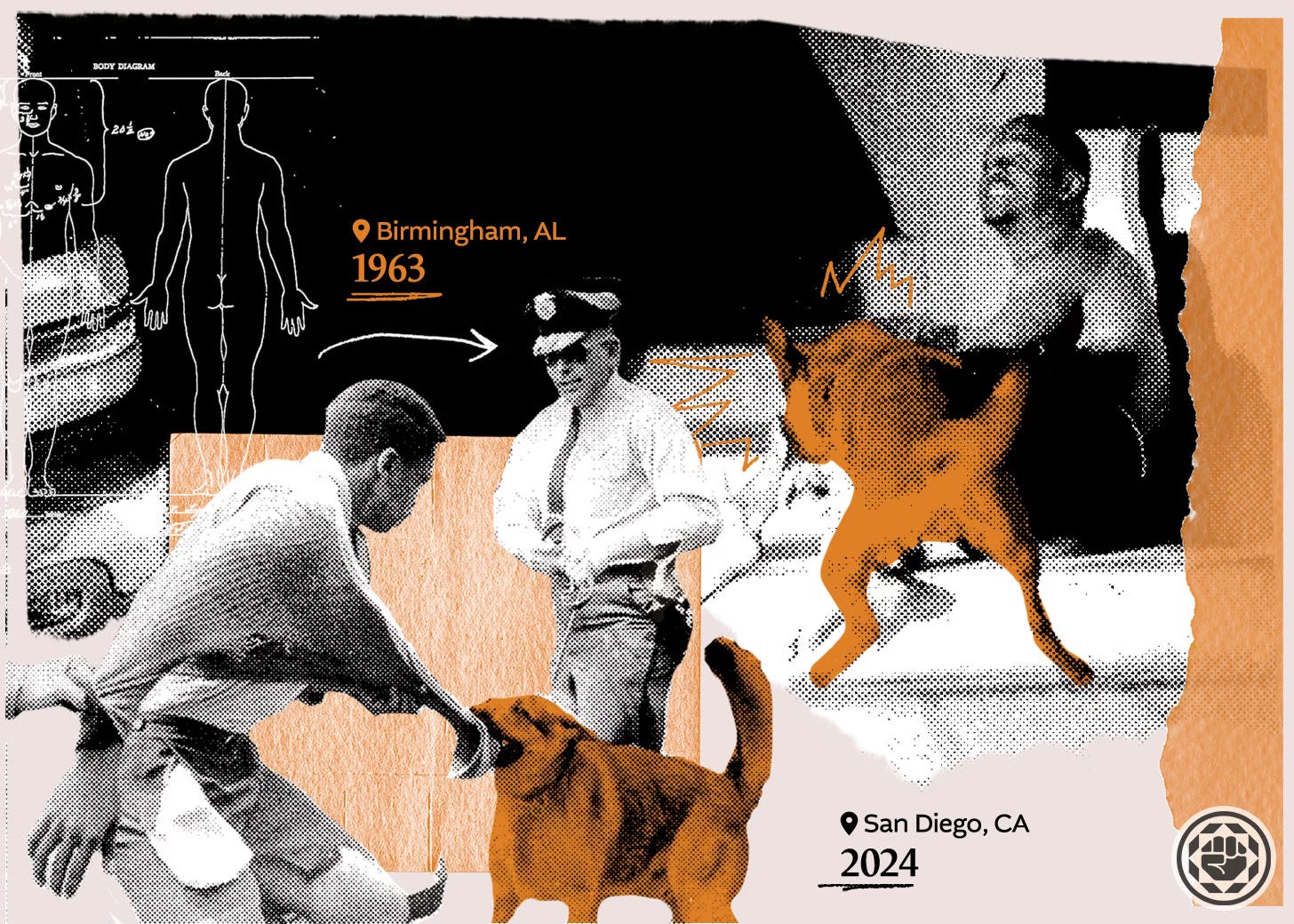 Today, the use of K9s by the San Diego Police Department remains a prolific way to subdue Black residents. Between 2018 and 2024, of 214 dog bite incidents recorded by SDPD, 26 percent involved a Black person. Black residents make up less than 6 percent of San Diego’s population.